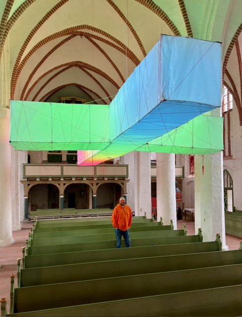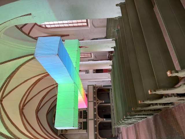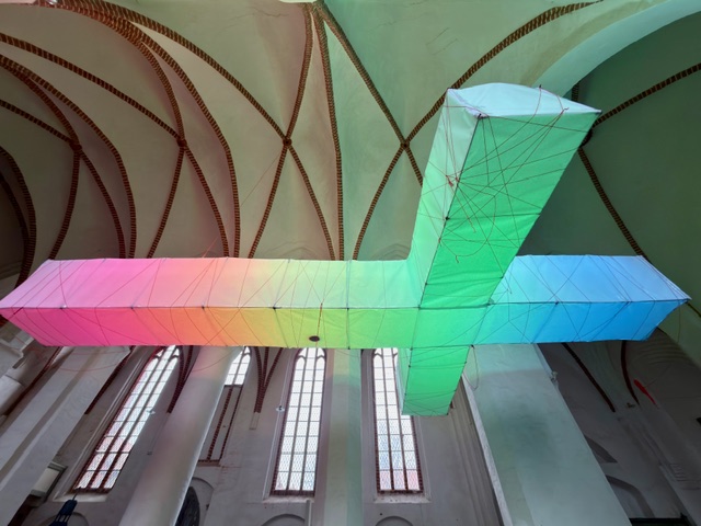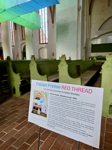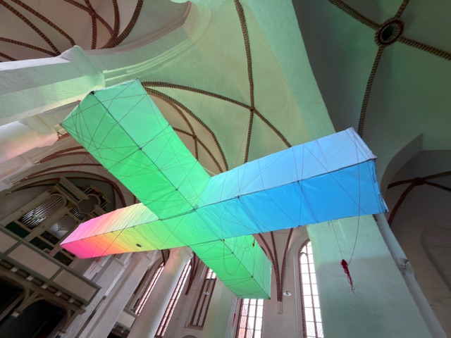 Kirchen sind über viele Jahrhunderte öffentliche Orte für Kunst. Sakrale Räume sind damit die Museen vor den Museen. An diese Tradition knüpft die Installation „Rainbow Cross" des Wuppertaler Künstlers Fabian Freese an. Regenbögen sind ein zentrales Motiv seiner Arbeiten. Sie stehen für Weltoffenheit, Toleranz und Diversität. Freese interessiert zugleich die Physik des Lichts: Weißes Licht enthält alle Farben. Ein Regenbogen entsteht nur, wenn Licht gebrochen wird.