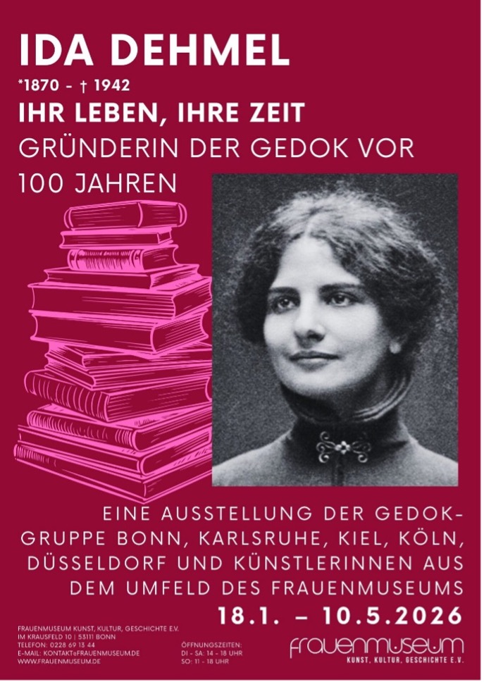 Ida Dehmel engagierte sich für Frauenrechte und das Frauenstimmrecht und gründete 1926 die GEDOK mit dem Ziel, Künstlerinnen aller Sparten zu fördern – ein Anliegen, das auch heute noch vom Frauenmuseum Bonn verfolgt wird. Während des Nationalsozialismus hatte Ida Dehmel als Jüdin keine Möglichkeit zur Flucht; sie entzog sich der bevorstehenden Deportation durch Suizid.